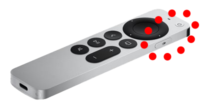 The TV is turned on and off by the Apple TV remote. Press the small power button on the remote to turn the TV on, and press and hold to turn it off. The side button allows voice searches: press and hold this button while speaking.
